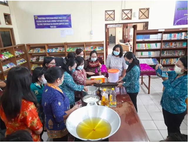 Selain itu, perpustakaan juga menggelar pelatihan pembuatan sabun dari minyak jelantah, sebagai upaya pengelolaan limbah rumah tangga yang ramah lingkungan dan bernilai ekonomis.